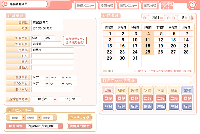 - 店舗情報では「ライセンスコード」「使用期限の更新」など認証に関する操作も行います。