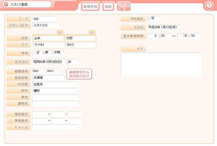 - スタッフ登録には以下の情報を登録する事ができます。