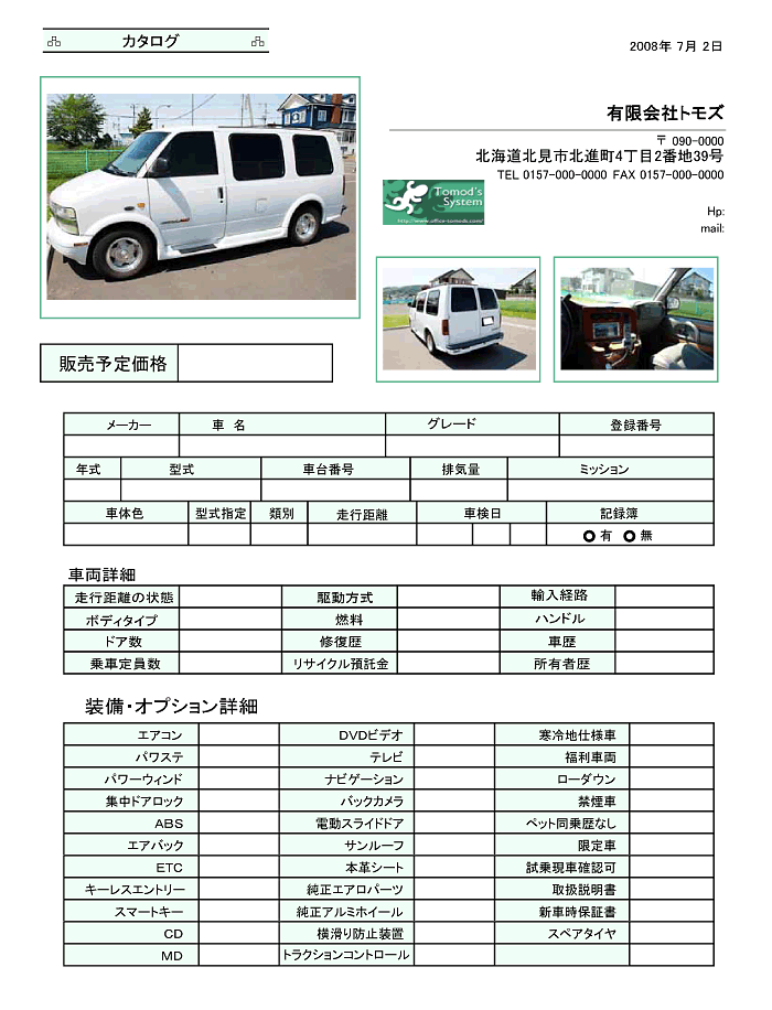 - 「カタログ」画面は、お客様に閲覧していただくことを前提に「車両管理」データを再構成して表示しています。また表示金額は「販売予定価格」のみで原価などは表示されません。